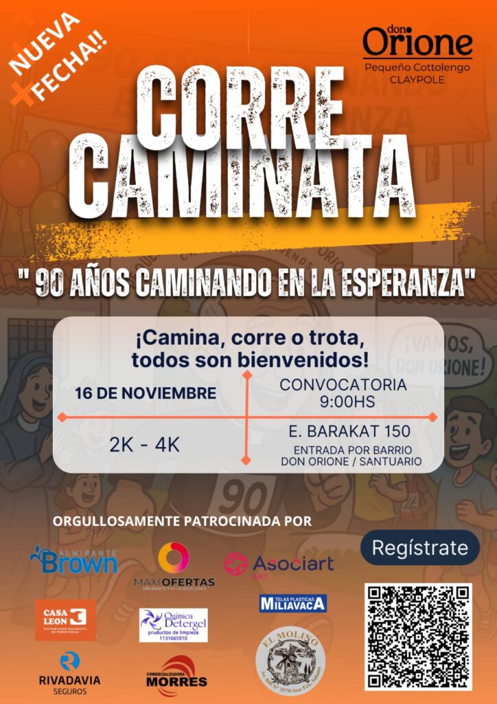Esta primera edición de la Corre Caminata es una maratón inclusiva, solidaria y abierta a todos. El evento nos permite celebrar dos hitos fundamentales de nuestra Obra: los 90 años del Pequeño Cottolengo de Claypole y los 25 años de la llegada de la reliquia del Corazón de Don Orione a nuestra casa.